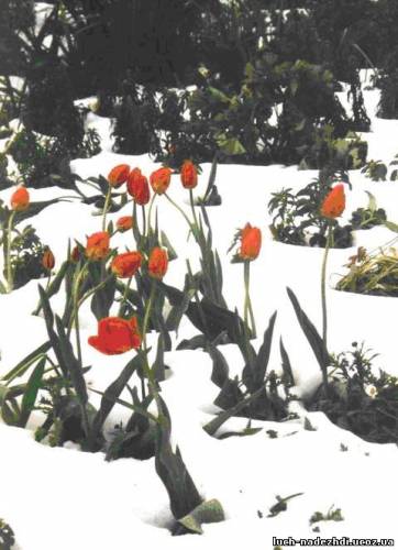 Покрывая снегом тюльпаны.